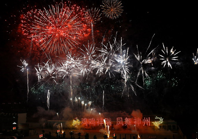 整場焰火晚會(huì)分“雞鳴祥瑞鳳舞神州”、“光明圣景”、 “圣農(nóng)騰飛”、“再創(chuàng)輝煌”四個(gè)樂章。一條條銀色飛龍?jiān)诳罩新祜w舞,清脆的鳴叫聲響徹夜空,預(yù)示著又一年春天的到來。夢(mèng)幻神奇的彩色花束,異彩紛呈的光柱,五光十色的焰火,構(gòu)成一幅幅激情四射、層次分明的動(dòng)感組合,與圣農(nóng)多姿多彩的夜景交相輝映,給人壯觀震撼而又清純靚麗的感覺。