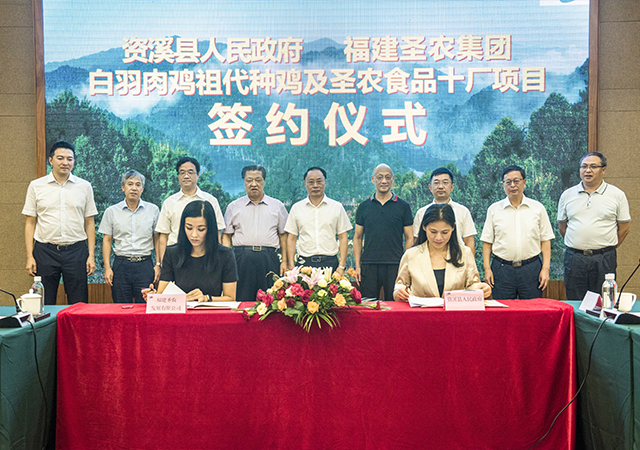 8月6日上午,圣農(nóng)集團(tuán)與資溪縣政府在大覺山酒店舉行“白羽肉雞祖代種雞及圣農(nóng)食品十廠項(xiàng)目”簽約儀式,吳淑琴縣長(zhǎng)、傅芬芳董事長(zhǎng)代表雙方簽訂協(xié)議,并互換文本。圣農(nóng)集團(tuán)創(chuàng)始人傅光明,中科院院士、江西農(nóng)業(yè)大學(xué)黨委書記黃路生,中國白羽肉雞首席科學(xué)家文杰,江西省農(nóng)業(yè)農(nóng)村廳副廳長(zhǎng)劉光華,撫州市副市長(zhǎng)徐國義,資溪縣委書記黃智迅等參加了簽約儀式。