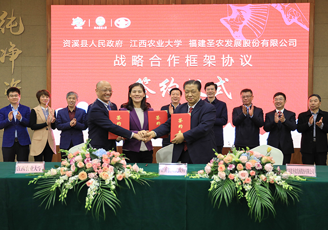 隨后,資溪縣政府、江西農(nóng)業(yè)大學(xué)、圣農(nóng)集團(tuán)在資溪縣大覺山國際酒店簽訂戰(zhàn)略合作框架協(xié)議,三方將合力在資溪縣打造出圣農(nóng)集團(tuán)第二個(gè)白羽肉雞育種基地。