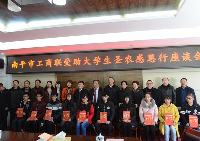 2月15日,南平市工商聯(lián)受助大學(xué)生圣農(nóng)感恩行活動(dòng)在圣農(nóng)集團(tuán)總部舉行。市工商聯(lián)主席、福建圣農(nóng)發(fā)展股份有限公司董事長(zhǎng)傅光明向閩北十縣(市、區(qū))的10名貧困大學(xué)生發(fā)放2萬元助學(xué)金和1千元新年紅包。